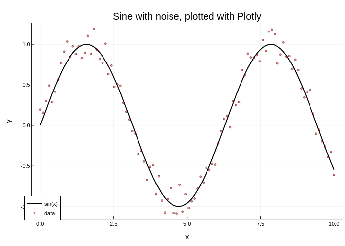 display(plot(x, y))Alternatively, we could call gui() at the end to do the same thing. Finally, if we have a plot object p, we can type display(p) to display the plot.